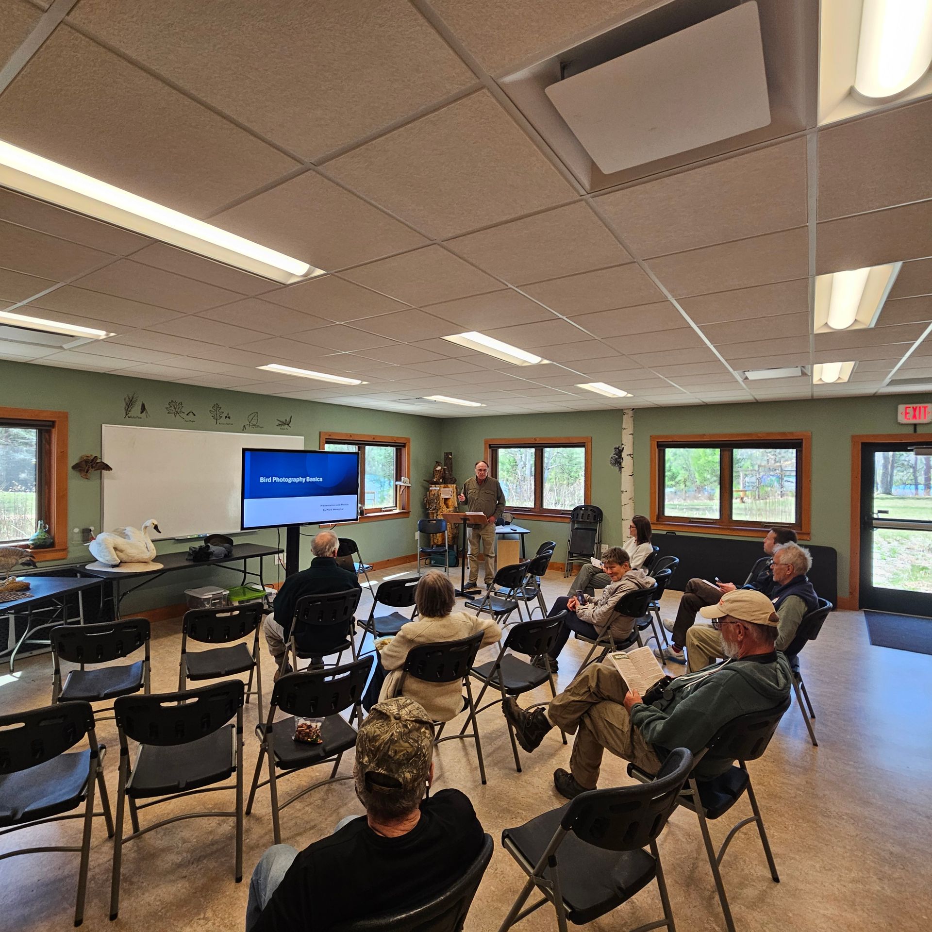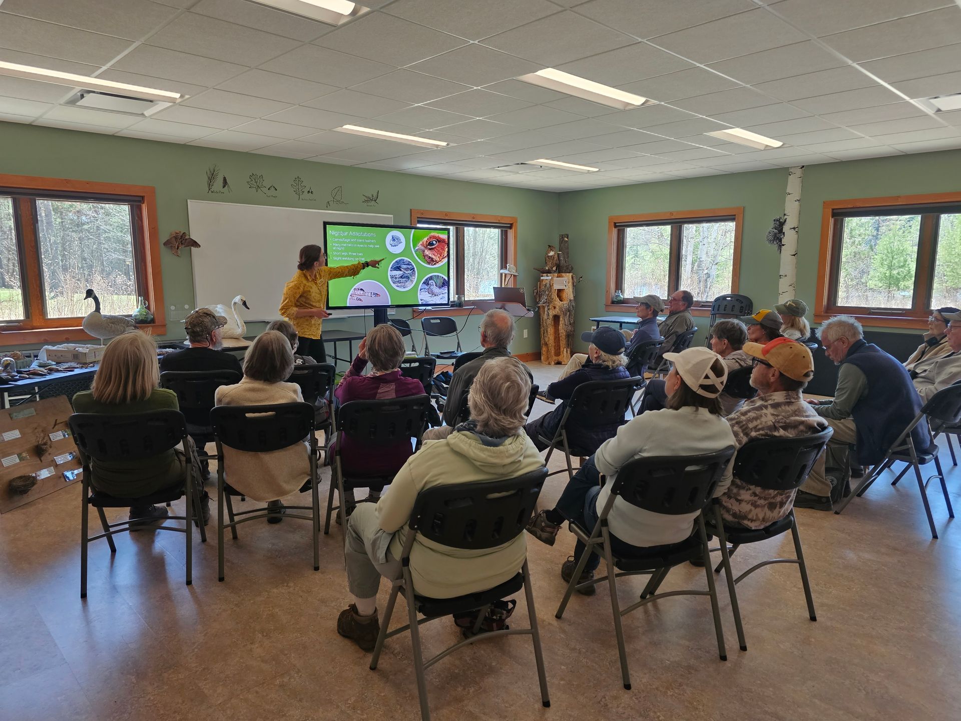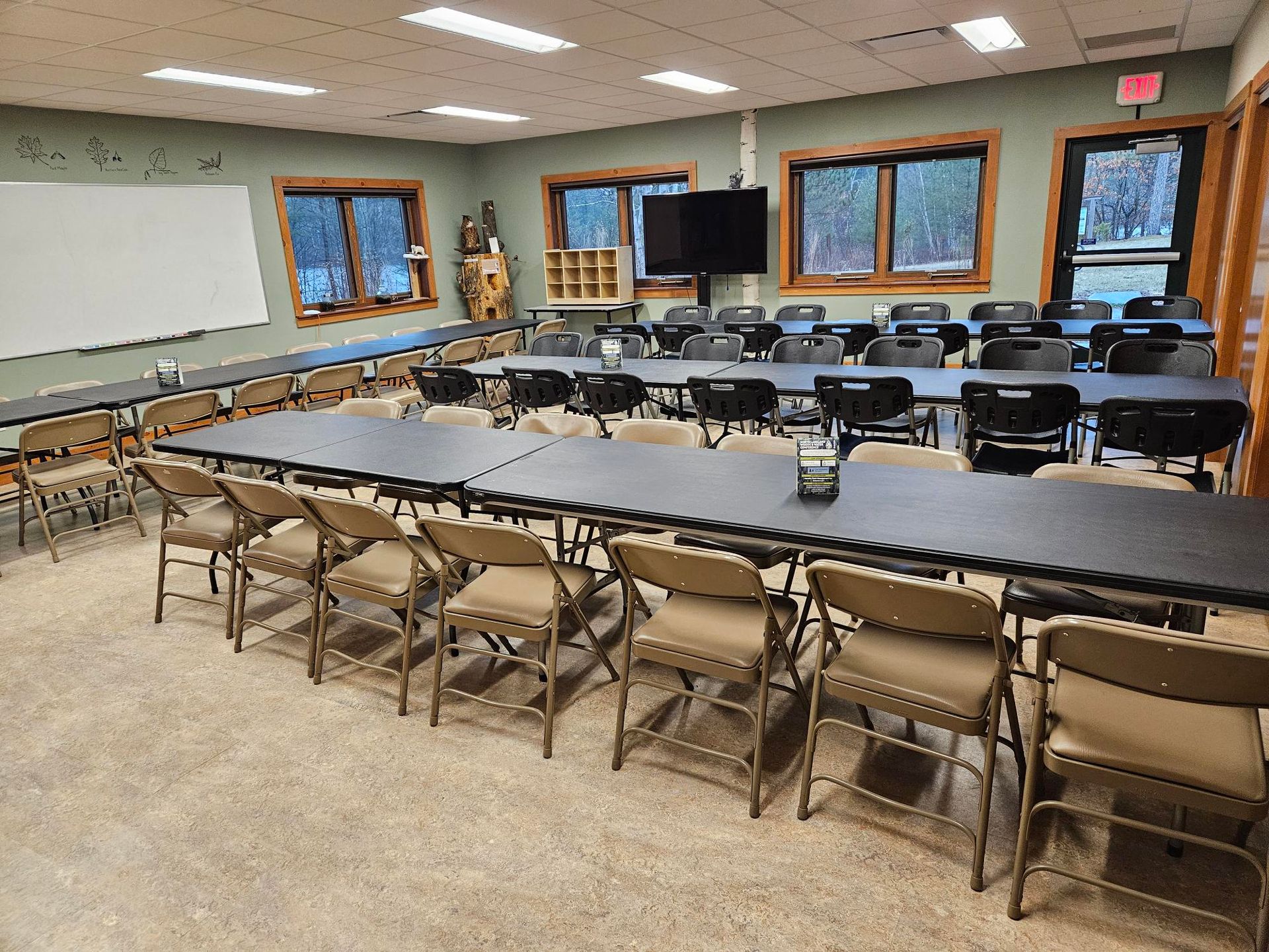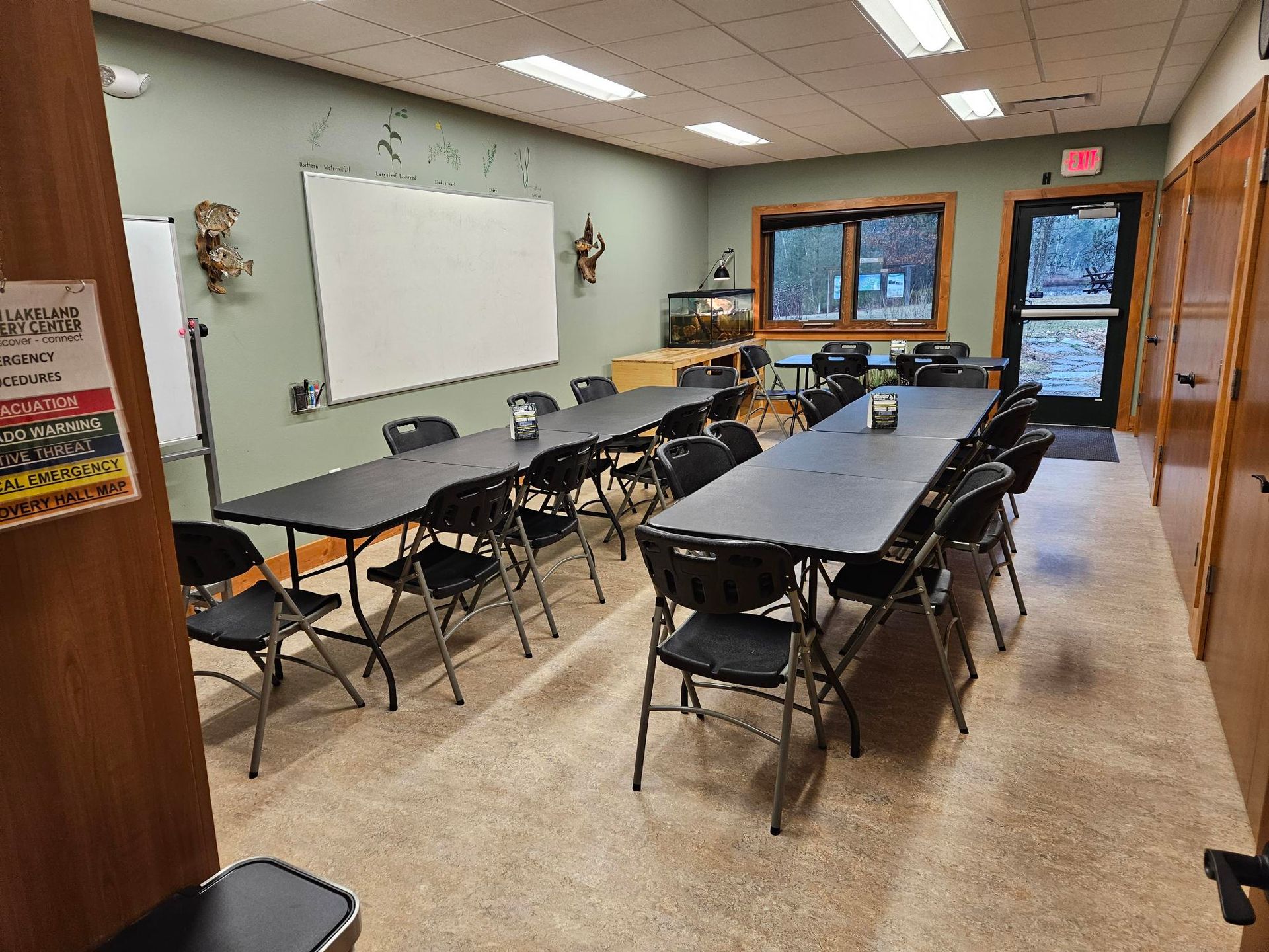 Water Room is a smaller classroom that seats up to XX people and offers a water-inspired setting with aquatic plants and animals painted on the walls. Both rooms provide comfortable, well-defined spaces in a quiet, nature-centered environment.